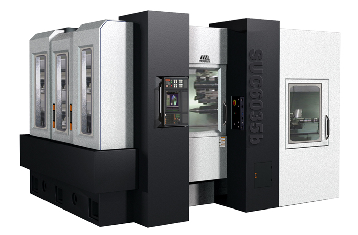 本机床主要用于完成石油钻头中的牙掌轴径部淬火后外圆、R槽及端面的精加工。替代淬火后磨削工序,恒线速度切削,效率高、精度高。本机床主要由立卧回转工作台、联动三坐标拖动单元及U轴进给加工单元组成,可实现其中任意四轴联动。A轴转台采用力矩电机结构,响应速度快,精度高。机床配有20把刀位的电动刀库和机械手装置。本机床采用西门子840D控制系统,并配有工件自动测量、自动校正装置,U轴及各直线轴配以直线光柵尺、旋转轴采用高分辨率角度编码器,实现全闭环反馈控制。机床采用整体式全防护,造型美观,防水防屑效果好。